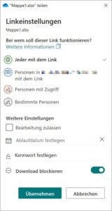 Sofern die anzuzeigenden Office-Dateien auf Office 365 (OneDrive bzw. SharePoint) gehostet werden, gibt es noch eine weitere, sehr elegante Möglichkeit der Integration als Webseite in FrontFace. Dazu muss die Datei (Word, Excel oder PowerPoint) zunächst in einer SharePoint-Bibliothek oder auf OneDrive abgelegt werden. Anschließend kann über die Funktion „Freigeben“ bzw. „Teilen“ ein Freigabe-Link erzeugt werden. Wichtig ist, dass hier (sofern gewünscht) die Funktion „Kann bearbeiten“ deaktiviert wird und ansonsten die Freigabe-Variante „Jeder mit dem Link“ und „Kein Passwort“ ausgewählt sind.