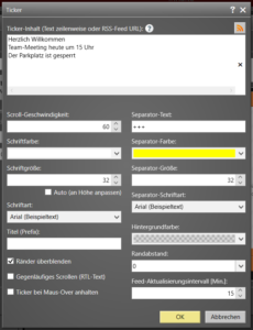 Das Erscheinungsbild des Tickers kann an Ihre Bedürfnisse in Bezug auf Scroll-Geschwindigkeit, Farben, Schriftart usw. angepasst werden. Sie können auch einen Titel (Prefix) angeben, der statisch vor dem Scrolltext angezeigt wird. Für Sprachen wie Hebräisch oder Arabisch können Sie die Laufrichtung des Tickers ändern.